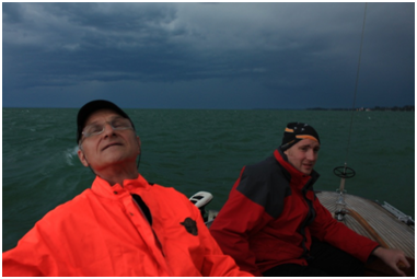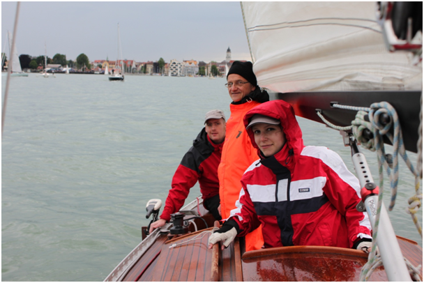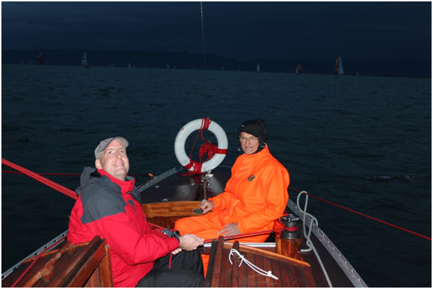 Nach tagelangen Vorbereitungen (Prüfen der Ausrüstung, Organisation der Verpflegung und Logistik, Vorbereiten der Navigation, Wetter einholen, Taktik festlegen, etc.) machte sich die „Vorhut“ mit Heiko Fritz, Gerd Beinhauer und Andreas Fink am Donnerstagabend auf den Weg von Langenargen nach Lindau. Bei angekündigtem schwerem Gewitter kam es auch prompt, wie es kommen musste: Böen mit 9 Bft, Wellen bis zum Großbaum und senkrecht über den See fliegendes Wasser unterzogen Crew und Schiff einem ersten Härtetest. Das Anlaufen eines Schutzhafens war unmöglich, so dass uns nichts übrig blieb als das Gewitter mit der Sturmfock direkt vor dem Lindauer Hafen abzureiten. Gegen 21.30 hatte sich das Wetter soweit beruhigt, dass wir zumindest den Hafen anlaufen konnten. Leider war der Verklicker zu diesem Zeitpunkt schon von Bord gegangen. Unsere „Heldentat“ war natürlich nicht unbemerkt geblieben, und so bekamen wir nach dem Einlaufen reichlich Anerkennung und Respekt von der Regattaleitung, die unseren Kampf mit den Elementen vom sicheren Hafen aus verfolgt hatte. Völlig durchgefroren und durchnässt legten wir uns nach einer Tasse heißer Tomatensuppe und etwas Kaffee erst einmal in die Koje.